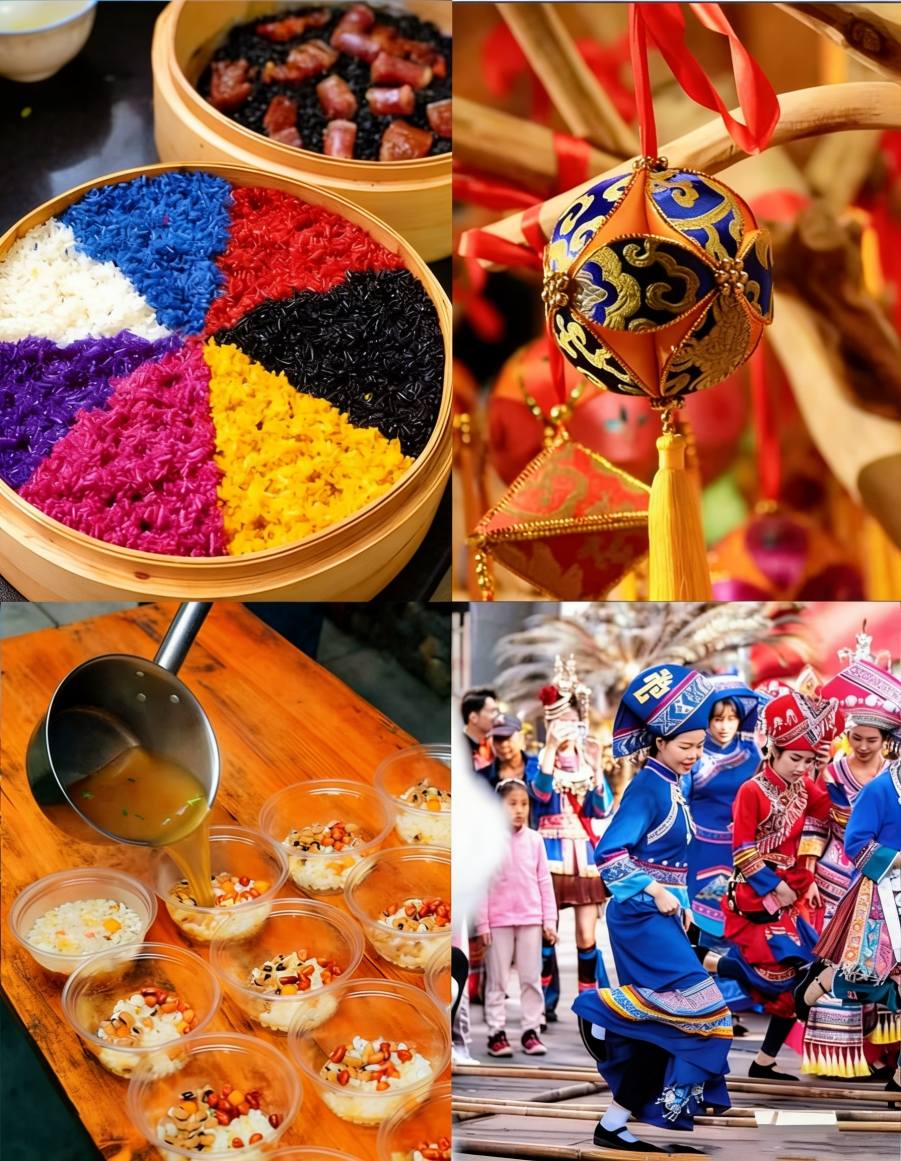 I tillegg til å synge, feirer folk ved å tilberede Five-Color Glutinous Rice farget med plantejuice, kaste broderte baller, danse bambusstangdanser og spille bronsetrommer.